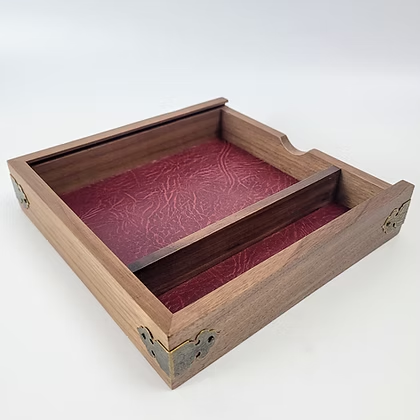 Expertly handcrafted in the United Kingdom, this tray is constructed from rich, solid walnut wood, known for its deep tones and exceptional durability. The interior is lined with a premium, deep red vegan leather that provides a smooth, consistent rolling surface and a striking colour contrast against the dark timber. To ensure it stands up to the rigours of travel, each corner is reinforced with metal protectors, and the wood is finished with a smooth, matt protective layer.